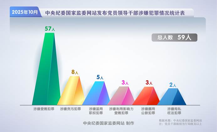 2025年10月,中央纪委国家监委网站发布的党纪政务处分信息中,59名被处分党员、干部均构成严重职务违法,57人被指涉嫌受贿犯罪,8人被指涉嫌贪污犯罪,5人被指涉嫌滥用职权犯罪,3人被指涉嫌利用影响力受贿犯罪,3人被指涉嫌挪用公款犯罪,2人被指涉嫌徇私枉法犯罪,其他还有涉嫌隐瞒境外存款罪、巨额财产来源不明罪、违法发放贷款罪等。