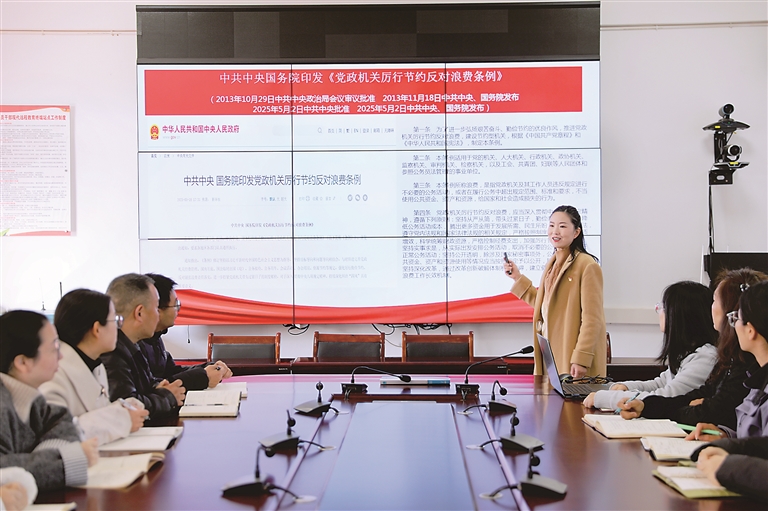 各级纪检监察机关抓实对党内法规制度的教育培训,以学促干,不断增强依规依纪依法履职能力和水平。图为纪检监察干部在组织学习《党政机关厉行节约反对浪费条例》。宁庭纪 摄